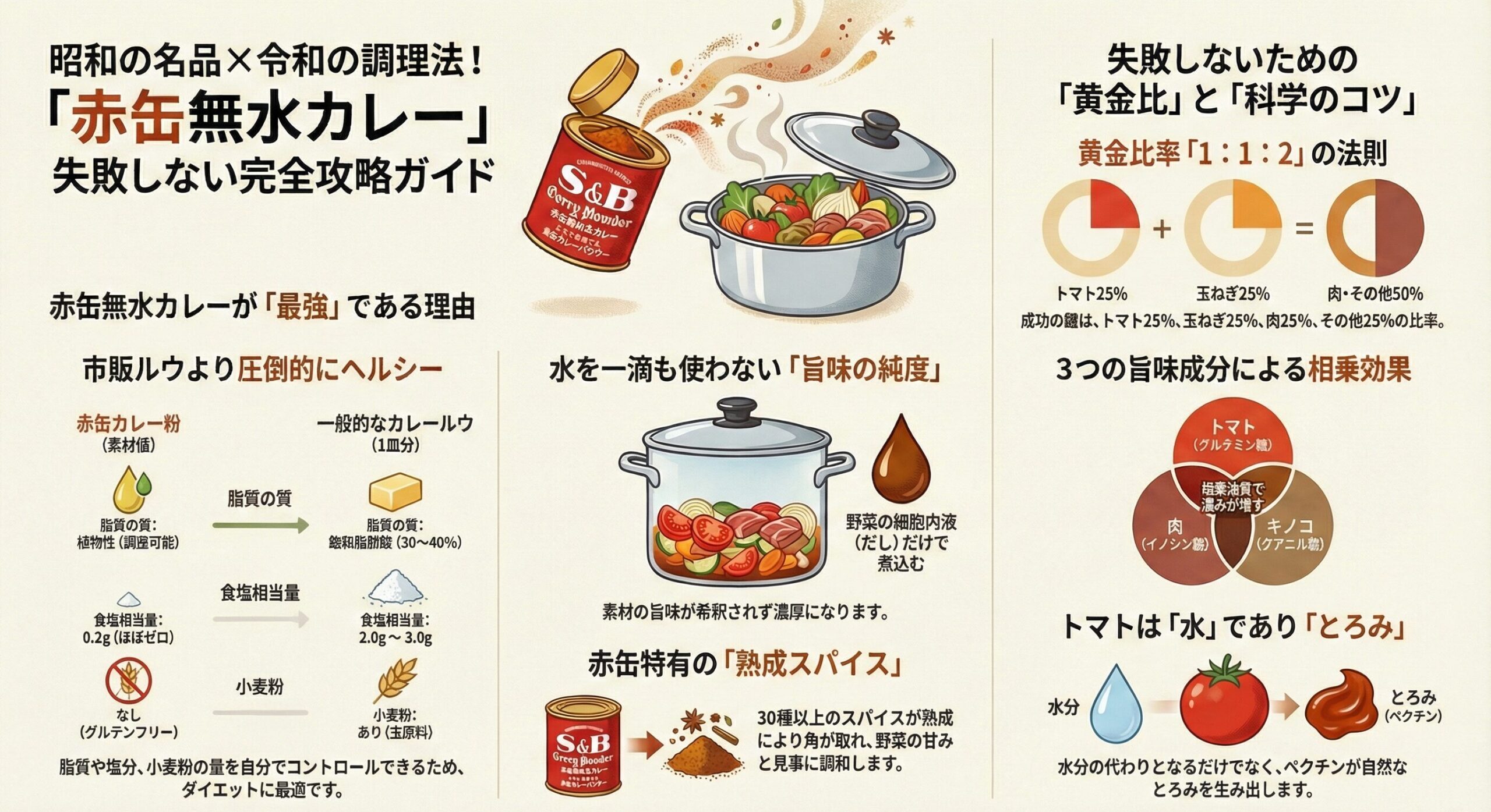 1950年(昭和25年)の発売以来、70年以上にわたって日本の食卓を見守り続けてきたエスビー食品の「赤缶」。なぜ今、このクラシックなカレー粉が、令和の時代において最新の調理法である無水カレーとこれほどまでに相性が良いと再評価されているのでしょうか。まずは、その美味しさの裏にある秘密と、現代人のライフスタイルにマッチする健康面でのメリットについて、じっくりと掘り下げていきましょう。