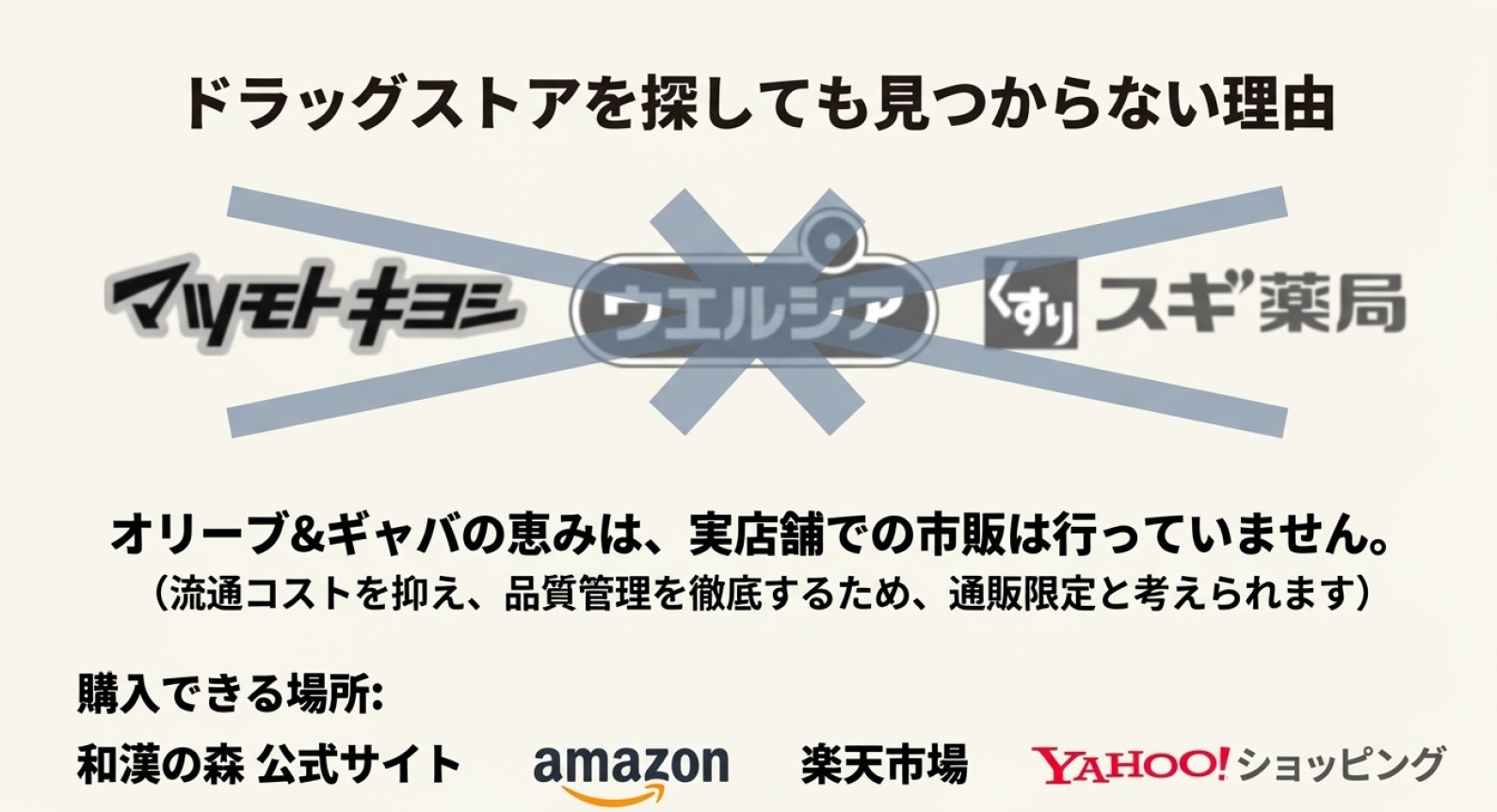インプット情報(オリーブ&ギャバの恵み口コミ まとめ)にも、「ドラッグストアでは販売していない」とはっきりと記載されています。