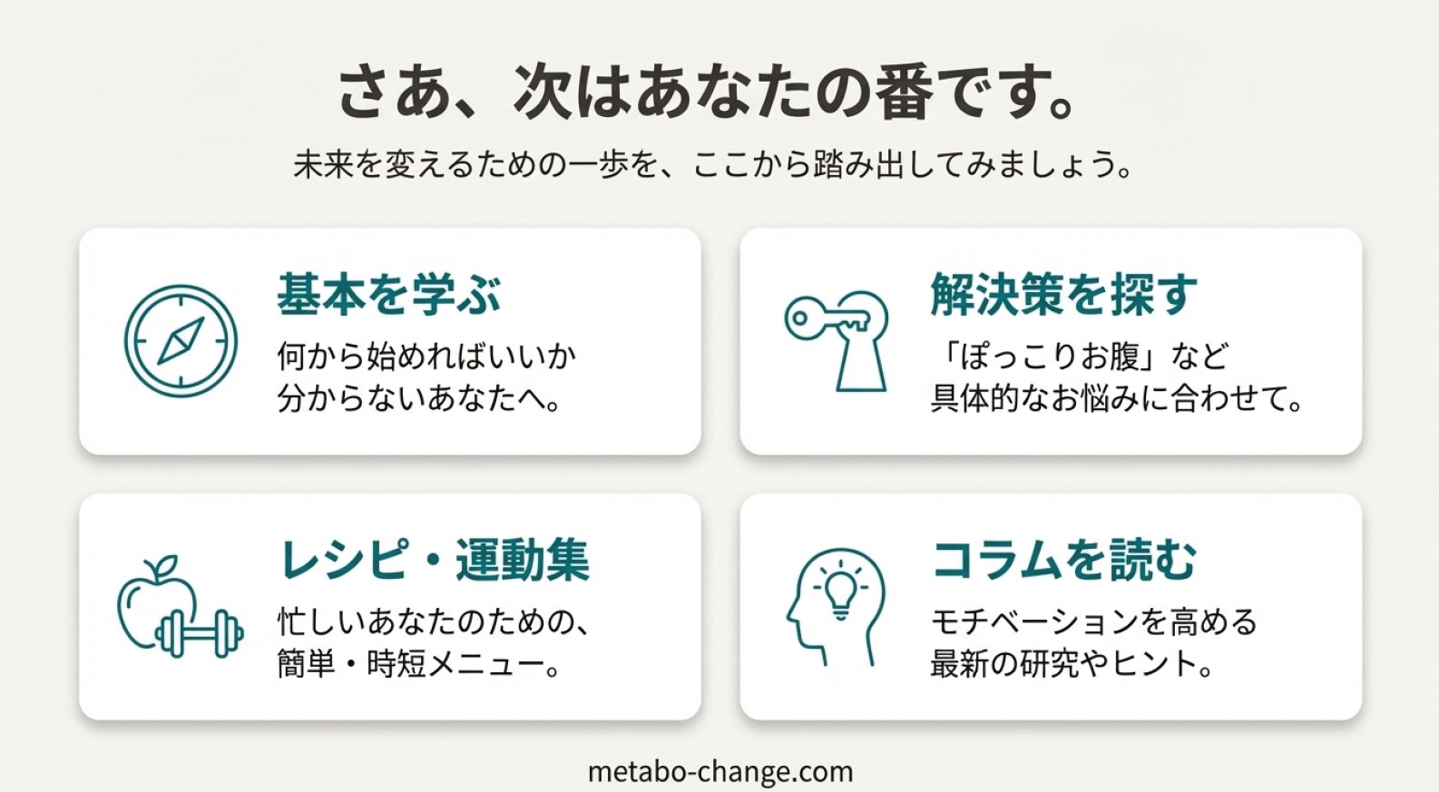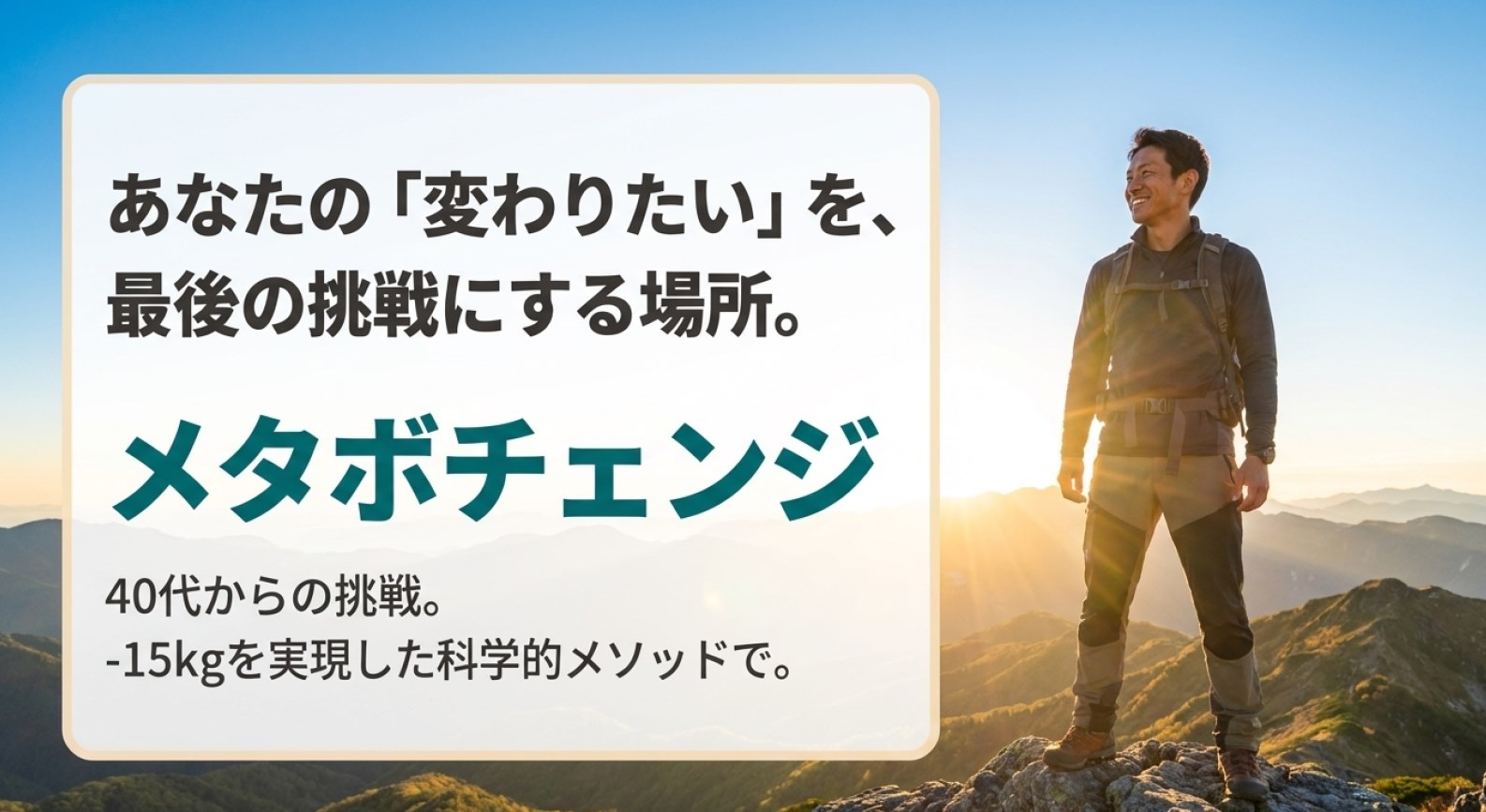 『メタボチェンジ』は、読者の皆様の利益を最優先に運営しています。サイト運営の費用を賄うため、記事内の一部にアフィリエイトプログラムを利用しておりますが、紹介する商品やサービスは、私が心から良いと信じ、効果を検証したもののみを、公平かつ中立的な視点で掲載することをお約束します。私たちの使命は、あくまであなたの目標達成をサポートすることです。