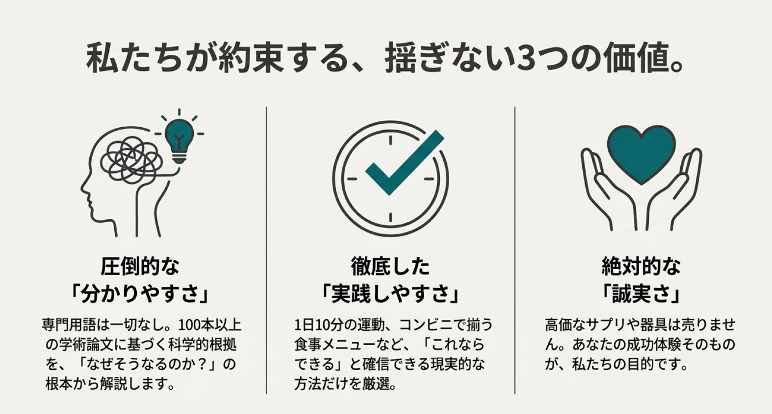 - 【価値3】絶対的な「誠実さ」 私たちは、あなたの不安に真摯に向き合います。高価なサプリメントや器具を売りつけることは決してありません。私たちの目的はあなたの成功体験そのものであり、すべての情報を無料で提供し、公平な視点でのみ発信することを誓います。