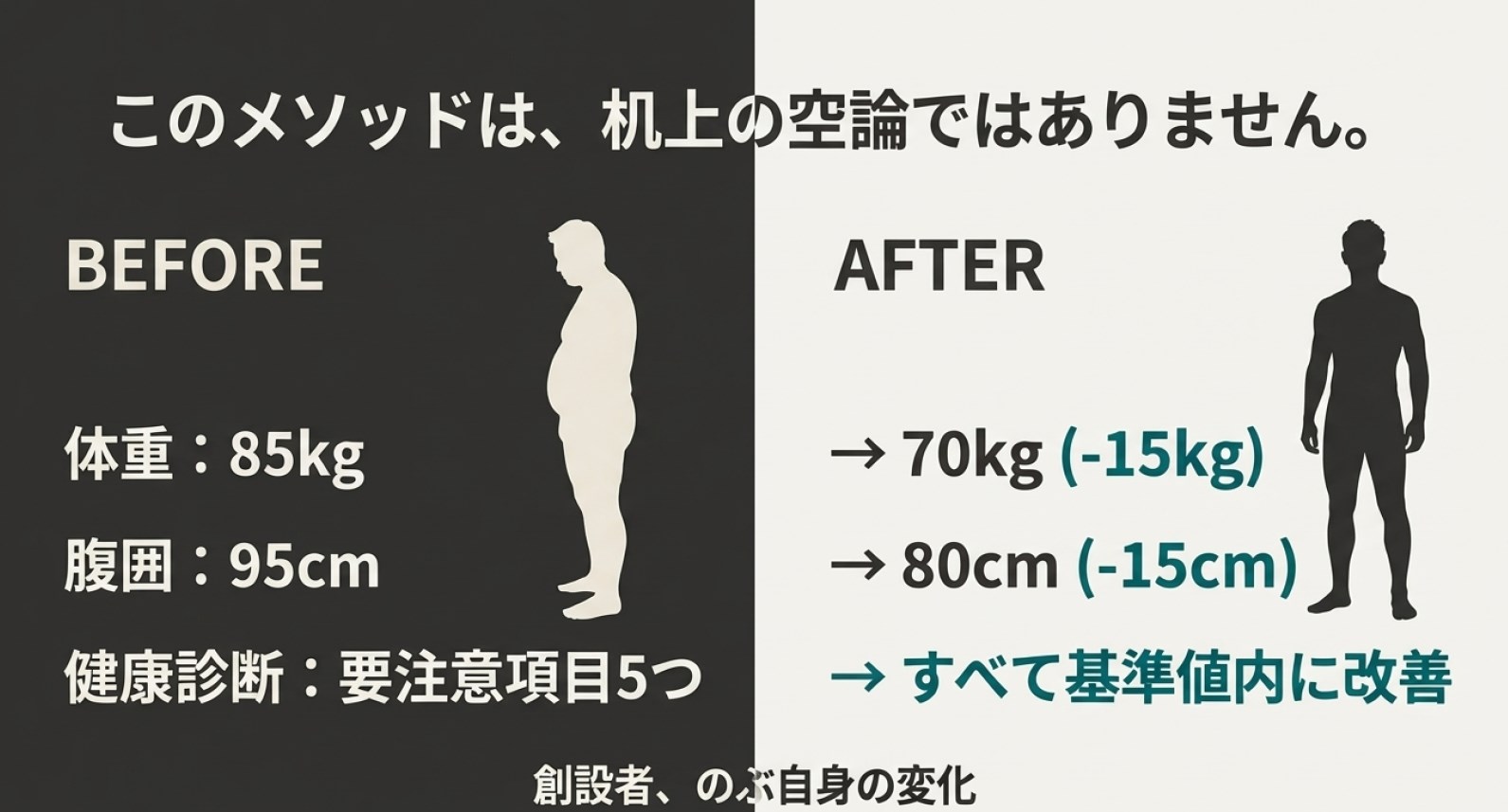 【ご挨拶】 はじめまして、のぶと申します。40代を迎え、仕事の責任も増す中で、私の身体は悲鳴を上げていました。鏡に映る姿にため息をつき、階段を上るだけで息が切れる日々。「このままではいけない」と一念発起するも、情報に振り回され失敗の連続。心身ともに疲弊しきっていました。